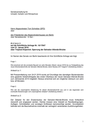 Drucksache 18 / 17 847 Schriftliche Anfrage 18. Wahlperiode Schriftliche Anfrage des Abgeordneten Tom Schreiber (SPD) vom 31. Januar 2019 (Eingang beim Abgeordnetenhaus am 12. Februar 2019) zum Thema: Treptow-Köpenick: Sperrung der Salvador-Allende-Brücke und Antwort vom 25. Februar 2019 (Eingang beim Abgeordnetenhaus am 01. März 2019) Die Drucksachen des Abgeordnetenhauses sind bei der Kulturbuch-Verlag GmbH zu beziehen. Hausanschrift: Sprosserweg 3, 12351 Berlin-Buckow · Postanschrift: Postfach 47 04 49, 12313 Berlin, Telefon: 6 61 84 84; Telefax: 6 61 78 28.