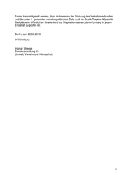 Senatsverwaltung für Umwelt, Verkehr und Klimaschutz Herrn Abgeordneten Frank Scholtysek (AfD) über den Präsidenten des Abgeordnetenhauses von Berlin über Senatskanzlei - G Sen - Antwort auf die Schriftliche Anfrage Nr. 18/20514 vom 14. August 2019 über Wegfall von Parkplätzen – 1/12 Treptow-Köpenick Im Namen des Senats von Berlin beantworte ich Ihre Schriftliche Anfrage wie folgt: Vorbemerkung der Verwaltung: Die Schriftliche Anfrage betrifft Sachverhalte, die der Senat nicht aus eigener Zuständigkeit und Kenntnis beantworten kann. Er ist gleichwohl bemüht, Ihnen eine Antwort auf Ihre Anfrage zukommen zu lassen und hat daher das Bezirksamt Treptow- Köpenick um Stellungnahme gebeten, die von dort in eigener Verantwortung erstellt und dem Senat übermittelt wurde. Sie wird in der Antwort an den entsprechend gekennzeichneten Stellen wiedergegeben. Frage 1: Wo und in welcher Anzahl fallen aufgrund von verkehrsplanerischen und städteplanerischen/städtebaulichen Maßnahmen, wie z.B. Bau von Fahrradwegen, Aufstellen von Parkscheinautomaten, Aus- und Umbau von Straßen und Straßenquerschnitten, Bau von Straßenbahnlinien, Reservierung von Parkplätzen ausschließlich für E-Fahrzeuge etc., im Bezirk Treptow-Köpenick aktuell und im Zeitraum bis zum Ende der 18. Wahlperiode Parkplätze zur allgemeinen Nutzung ersatzlos weg? Frage 2: Wo und in welcher Anzahl fallen in Treptow-Köpenick Parkplätze zur allgemeinen Nutzung, ebenfalls aufgrund der unter 1. genannten Ursachen, nach jetzigem Planungsstand über den Zeitraum der 18. Wahlperiode hinaus ersatzlos weg? Antwort zu 1 und 2: Das Bezirksamt Treptow-Köpenick teilt hierzu mit: „Eine detaillierte Beantwortung dieser Frage ist aufgrund der personellen Ausstattung des Stadtentwicklungsamtes und des Straßen- und Grünflächenamtes (SGA) und der Vielzahl anderer, prioritärer Aufgaben nicht möglich, auch nicht zu einem späteren Zeitpunkt. 1