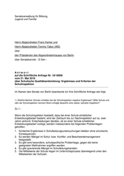 Senatsverwaltung für Bildung, Jugend und Familie Herrn Abgeordneten Franz Kerker und Herrn Abgeordneten Tommy Tabor (AfD) über den Präsidenten des Abgeordnetenhauses von Berlin über Senatskanzlei - G Sen - Antwort auf die Schriftliche Anfrage Nr. 18/18956 vom 21. Mai 2019 über Schulische Qualitätsentwicklung: Ergebnisse und Kriterien der Schulinspektion _____________________________________________________________________________________________________ Im Namen des Senats von Berlin beantworte ich Ihre Schriftliche Anfrage wie folgt: 1.) Welche Berliner Schulen erhielten bei der Schulinspektion negative Ergebnisse? (Bitte Schule und Jahr der Schulinspektion nennen) Wann erfolgte daraufhin eine zweite, zeitnahe Inspektion? Zu 1.: Wenn die Schulinspektion feststellt, dass bei einer Schule erheblicher Entwicklungsbedarf besteht, wird der Zeitraum bis zur Nachinspektion auf ca. zwei Jahre verkürzt. Entscheidungen darüber, ob an einer Schule erheblicher Entwicklungsbedarf vorliegt, werden insbesondere bei folgenden Problemlagen getroffen: 1. Schlechte Ergebnisse in Schulleistungsuntersuchungen bleiben ohne schulische Konsequenzen. 2. Es werden Mängel im Schul- bzw. Konflikt- und Beschwerdemanagement festgestellt. 3. Es gibt eine besondere, schulspezifische Problemlage, gegen die keine geeigneten Maßnahmen ergriffen werden. 4. Es gibt gravierende Mängel im Schulleitungshandeln. 5. Die Mittelwerte der Schule liegen im Unterrichtsprozess überwiegend unter den Mittelwerten der Schulart.