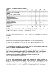 3 Verteilung auf die Bezirke und Schularten: Bezirk B G K S Y Mitte 2 3 Friedrichshain-Kreuzberg 1 1 Pankow 2 Charlottenburg-Wilmersdorf Spandau 1 2 1 1 Steglitz-Zehlendorf 2 2 Tempelhof-Schöneberg 6 Neukölln 1 3 Treptow-Köpenick 1 Marzahn-Hellersdorf 3 3 1 Lichtenberg 2 2 Reinickendorf 3 2 1 Summe 2 26 15 2 1 Nachinspektionen sind bisher an 43 dieser Schulen durchgeführt worden. Die übrigen Nachinspektionen erfolgen im Schuljahr 2019/2020. 2.) Welche Handlungsaufforderungen sind mit einer negativen Einschätzung der Schulinspektion verbunden? Zu 2.: Die Inspektionsberichte enden mit einem Fazit, in dem das Inspektionsteam Erwartungen formuliert, die im Rahmen der Nachinspektion überprüft werden. 3.) Welche negativen Konsequenzen drohen Schulen, die die von der Schulinspektion angemahnten Defizite nicht beheben und wie ist dies rechtlich geregelt? Die Ursachen für das Vorliegen erheblichen Entwicklungsbedarfs sind vielfältig und sehr individuell. Verallgemeinernd lässt sich festhalten, dass diese in den meisten Fällen auf Defizite im Schulleitungshandeln, Kommunikationsprobleme in den Kollegien der Schulen sowie Schwierigkeiten bei der Umsetzung der Schulstrukturreform zurückzuführen sind. 4.) Prof. Dr. Kathrin Dedering schreibt: „Schulen, deren Ergebnisse eher schwach einzustufen sind, könnte man einen größeren Entwicklungsbedarf zuweisen. Dieser Logik folgend werden in einigen Bundesländern denn auch Schulen identifiziert, die eine vorab definierte Mindesnorm von Schulqualität nicht erreicht haben.“ (Pädagogik 1/16, 44-47, 45.) Welche Mindesnorm von Schulqualität gilt in Berlin und welche Mindesnorm von Schulqualität gilt in anderen Bundesländern?