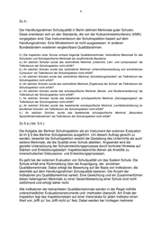 5 Informationen zu einem Indikator keine schematischen Rechenoperationen im Sinne einer Mittelwertbildung durchgeführt, sondern die Einzelergebnisse gegeneinander abgewogen. Abschließend bewertet das Inspektionsteam die Ausprägung der einzelnen Qualitätsmerkmale nach der jeweils vorgegebenen Normierung, dokumentiert diese im Bewertungsbogen und fasst die Ergebnisse im Qualitätsprofil der Schule zusammen. Im Folgenden sind die Ergebnisse der ergänzenden Qualitätsmerkmale dargestellt. Diese werden je nach Schulart zusätzlich inspiziert. Bei 380 der insgesamt 690 inspizierten Schulen wurde beispielsweise das Qualitätsmerkmal „E.1 Förderung der Sprachkompetenz“ hinzugenommen, weil die Schulen zusätzliche personelle Mittel für die Sprachförder- und Sprachbildungsmaßnahmen erhalten. Insgesamt meldet die Schulinspektion den Schulen die Ausprägung einzelner Qualitätsmerkmale in vier Stufen von „A - stark ausgeprägt“ bis „D - schwach ausgeprägt“ zurück, keineswegs „nicht erfüllt“. Berlin, den 1. Juni 2019 In Vertretung Beate Stoffers Senatsverwaltung für Bildung, Jugend und Familie