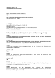 Frage 6: Welche Auswirkungen wird der Mietendeckel nach Auffassung der landeseigenen Wohnungsbaugesellschaften auf die geplanten Neubauvorhaben haben? (Bitte Einschätzung jeder einzelnen landeseigenen Wohnungsbaugesellschaft) Frage 7: Welche Auswirkungen wird der Mietendeckel nach Auffassung der landeseigenen Wohnungsbaugesellschaften auf die Sanierung und Instandhaltung des Wohnungsbestandes haben? (Bitte Einschätzung jeder einzelnen landeseigenen Wohnungsbaugesellschaft) Frage 8: Gehen die landeseigenen Wohnungsbaugesellschaften davon aus, dass bereits geplante Sanierungen trotz des Mietendeckels durchgeführt werden können? (Bitte Einschätzung jeder einzelnen landeseigenen Wohnungsbaugesellschaft) Frage 9: Wie wird sich nach Einschätzung des Senats die Sanierungsrate bei den landeseigenen Wohnungsbaugesellschaften nach Einführung eines Mietendeckels entwickeln – wird diese steigen oder sinken? (bitte mit Begründung) Antwort zu 4, 5, 6, 7, 8 und 9: Bisher sind lediglich die Eckpunkte des Mietendeckels vom Senat beschlossen worden. Die Senatsverwaltung für Stadtentwicklung und Wohnen wurde beauftragt, auf der Grundlage der Eckpunkte einen Gesetzentwurf zu erarbeiten. Zum gegenwärtigen Zeitpunkt können noch keine Aussagen zur Veränderungen der Bau- und Wirtschaftsplanungen der städtischen Wohnungsunternehmen getroffen werden. Frage 10: Hält der Senat eine möglichst hohe Sanierungsrate im Gebäudebestand für ein wichtiges, probates Mittel, um das übergeordnete Ziel der Klimaneutralität 2050 erreichen zu können? (bitte mit Begründung) Frage 11: Wie wirkt sich die Einführung des Mietendeckels bei den landeseigenen Wohnungsbaugesellschaften auf die Erreichung des o.g. Klimaziels aus? Ist dieser der Klimaneutralität förderlich oder hinderlich? (bitte mit Begründung)? Gibt es hierzu entsprechende Stellungnahme und/oder Berechnungen der für Energie und Umwelt zuständigen Senatsverwaltungen SenWiEnBe und SenUVK? Wie sehen diese aus? Antwort zu 10 und 11: Der Senat geht davon aus, dass erforderliche Sanierungen im Gebäudebestand auch unter Beachtung der Eckpunkte des Mietendeckels weiterhin planbar sind, um das übergeordnete Ziel der Klimaneutralität 2050 zu erreichen. Berlin, den 12.07.2019 In Vertretung Scheel ................................ Senatsverwaltung für Stadtentwicklung und Wohnen 2