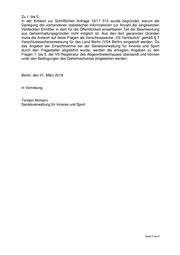 Senatsverwaltung für Inneres und Sport Herrn Abgeordneten Marcel Luthe (FDP) über den Präsidenten des Abgeordnetenhauses von Berlin über Senatskanzlei - G Sen - Antwort auf die Schriftliche Anfrage Nr. 18/17 937 vom 13. Februar 2019 über Verdeckte Ermittler III ----------------------------------------------------------------------------------------------------------------- Im Namen des Senats von Berlin beantworte ich Ihre Schriftliche Anfrage wie folgt: Der Senat hat auf meine Anfrage 18/17515 erneut leider nur unvollständig geantwortet. Es ist nicht erkennbar, in-wieweit eine retrograde Betrachtung von in der Vergangenheit eingesetzten Verdeckten Ermittlern pauschal "das Staatswohl gefährden" solle. Ebenso wenig ergeben sich einsatztaktische Erkenntnisse aus der Anzahl von einge-setzten Personen. Auf der anderen Seite ist es im Rahmen der Kontrolle der Exekutive durch das Parlament in einer parlamentarischen Demokratie von erheblicher Bedeutung, den Umfang derartiger verdeckter Maßnahmen der Exekutive gegen die eigenen Bürger einschätzen zu können. Auch ist nicht erkennbar, welche Staatswohlrelevanz die Anzahl von Aliasidentitäten oder die Frage, wie viele (ggf. prozentual) der Anordnungen der Polizeipräsident selbst getroffen hat, haben sollte. Für das Staatswohl sehr wohl relevant ist - im Hinblick auf die Kontrolle der Exekutive durch die Legislative - jedoch die Information an diese, wie häufig der Senat Urkunden wie etwa Ausweisdokumente mit objektiv unwah-rem Inhalt hat erstellen lassen, um zu erkennen, in welchem Umfang von dieser ausnahmsweisen Möglichkeit Gebrauch gemacht worden ist und daraus gesetzgeberisches Handeln abzuleiten. Schließlich ist es auch nicht Sache der kontrollierten Regierung, dem Parlament die Wahl des Mittels der Kontrolle vorzuschreiben. Eine Akteneinsicht nach Art. 45 II VvB ermöglicht allenfalls dem Einsehenden einen Eindruck, nicht aber über eine - ggf. als VS einzustufende - Drucksache dem Parlament als solches. Zudem wird die parlamentarische Kontrolle massiv erschwert, wenn Ort und Zeit der Information durch den Senat bestimmt werden können. In Erfüllung einer etwaigen Konfrontationsobliegenheit frage ich daher erneut: 1. Wie viele Personen sind in den Jahren 2011 bis 2018 jeweils jährlich als Verdeckte Ermittler auf Grundlage des § 110 a StPO in Berlin eingesetzt worden? 2. Über welchen Zeitraum waren diese jeweils tätig und wie viele Aliasidentitäten haben diese verwendet? In wie vielen Fällen sind für diese Urkunden im Sinne des § 110 a Abs. 3 StPO erstellt worden? (Ggf. öffentlich zumindest in relativen Zahlen angeben) 3. Wie viele Personen sind in den Jahren 2011 bis 2018 jeweils jährlich als Verdeckte Ermittler auf Grundlage des § 26 Abs. 1 Nr. 2 ASOG in Berlin eingesetzt worden? 4. Über welchen Zeitraum waren diese jeweils tätig und wie viele Aliasidentitäten haben diese verwendet? In wie vielen Fällen sind für diese Urkunden im Sinne des § 110 a Abs. 3 StPO erstellt worden? (Ggf. öffentlich zumindest in relativen Zahlen angeben) 5. Wie viele Anordnungen nach § 26 Abs. 4, 2. TS hat es in den Jahren 2011 bis 2018 jeweils jährlich in Berlin gegeben? Wie viele sind durch den jeweiligen Polizeipräsidenten erfolgt, wie viele durch den Stellvertreter? (Ggf. öffentlich zumindest in relativen Zahlen angeben) Seite 1 von 2