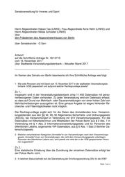 Senatsverwaltung für Inneres und Sport Herrn Abgeordneten Hakan Tas (LINKE), Frau Abgeordnete Anne Helm (LINKE) und Herrn Abgeordneten Niklas Schrader (LINKE) über den Präsidenten des Abgeordnetenhauses von Berlin über Senatskanzlei - G Sen - Antwort auf die Schriftliche Anfrage Nr. 18/12719 vom 16. November 2017 über Stadtweite Veranstaltungsdatenbank – Aktueller Stand 2017 ----------------------------------------------------------------------------------------------------------------- Im Namen des Senats von Berlin beantworte ich Ihre Schriftliche Anfrage wie folgt: 1. Wie viele Personen sind mit Stand vom 15. November 2017 in der stadtweiten Veranstaltungsda- tenbank (VDB) gespeichert und aufgrund welcher Rechtsgrundlage jeweils? Zu 1.: Insgesamt sind in der Veranstaltungsdatenbank zirka 11.400 Datensätze mit perso- nenbezogenen Daten vorhanden. Zu jeder Veranstaltung wird ein Datensatz erfasst. so dass auf Grund von Mehrfach- oder Daueranmeldungen von einer hohen Zahl von Mehrfacherfassungen auszugehen ist. Eine genaue Angabe ist wegen fehlender Re- cherche- und Filtermöglichkeiten nicht möglich. Die Rechtsgrundlage ergibt sich für die Daten des Anmeldenden bzw. Versamm- lungsleitenden aus den §§ 42, 48, 50 Allgemeines Sicherheits- und Ordnungsgesetz (ASOG), bei Versammlungen in Verbindung mit §14 Versammlungsgesetz. Für die Datensätze von Mitarbeiterinnen und Mitarbeitern der Polizei Berlin aus § 2 Abs. 1 in Verbindung mit § 1 Abs. 2 Informationsverarbeitungsgesetz und für Personen des öffentlichen Lebens, sogenannte VIP-Datensätze, aus § 6 Abs. 1 Satz 2 Berliner Da- tenschutzgesetz. 2. Welchen verschiedenen Kategorien (Anmelder*in von Versammlungen nach dem Versammlungs- gesetz; Anmelder*innen von Veranstaltungen, die nicht dem Versammlungsgesetz unterliegen; Personen des öffentlichen Lebens etc.) sind jeweils wie viele der in der VDB gespeicherten Perso- nen zugeordnet? Zu 2.: Eine statistische Erhebung über die Zuordnung der einzelnen Datensätze erfolgt bei der Polizei Berlin nicht. 3. In welchem Status befindet sich die Überarbeitung der Errichtungsanordnung (EA) für die VDB? Seite 1 von 4