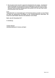 8. Wie oft wurden seit dem Jahr 2011 sogenannte Verlaufsberichte oder sonstige – einschätzende – Zusammenfassungen von Demonstrationen und Kundgebungen im Land Berlin von der Polizei Berlin an den Berliner Verfassungsschutz (Abteilung II, Senatsverwaltung für Inneres und Sport) übersandt? Welche konkreten Veranstaltungen waren betroffen und in wie vielen Fällen wurden personenbezogene Daten übermittelt? Zu 8.: Verlaufsberichte von Veranstaltungen mit Extremismusbezug werden von der Polizei auf Basis der gesetzlichen Grundlagen an den Verfassungsschutz übermittelt. Die Anzahl der übermittelten Berichte wird statistisch nicht erfasst. Berlin, den 28. November 2017 In Vertretung Torsten Akmann Senatsverwaltung für Inneres und Sport Seite 4 von 4
