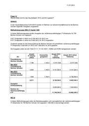11.01.2012 Frage 13. Welche Mittel wurden im Haushaltsjahr 2008/2009 und 2010/2011 im Rahmen des Projketes eAdministration konkret investiert und ausgegeben? Antwort (in T€): Haushaltsjahr (HHJ) 2009 IST 2010 IST Stand Gesamt- 31.12.2011 kosten Projektsteuerung 646 711,2 € 1.357 Hardwareinvest verfahrensunabhängige IT-Infrastruktur 1.217 3.925,6 € 5.143 Beschaffung und Implementierung Schulmanagementlösung (inkl. Ausgaben für Schulungen) 0 1.399,4 € 1.399 Beschaffung und Implementierung Schulsystemmanagementlösung 0 874,4 € 874 Softwarelizenzen für zentrale Systeme 948 293,8 € 1.242 Summe 10 00/812 60 2.811 7.205 10.016 Nachrichtlich Sollveränderung von 10 00/812 60 an 10 00/425 11 (Deckungsvermerk Haushaltsplan) 51 51 Summe für die Jahre 2010/2011 2.862 7.205 10.067 Ansatz und IST HHJ 2009 1.000 1.000 Nachrichtlich (10 00/Diverse Titel Maßnahmengruppe 01) 4.415 3.057 7.472 Gesamt-Projektkosten/-ausgaben 1.000 7.277 10.262 18.539 nachrichtlich Rest HHJ 2010 2.723 2.723 nachrichtlich Rest HHJ 2011 678 678 nachrichtlich 1000/54060 Einsparung anteilige Erwirtschaftung Pauschale Mindereinnahmen (PMA) durch eGovernment (597 T€ Informations- und Kommunikationstechnik und 313 T€) 910 910 Ursprüngliche Projektkosten 1.000 10.000 11.850 22.850