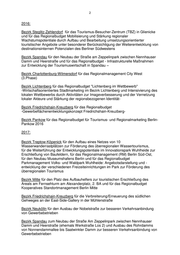 2 2016: Bezirk Steglitz-Zehlendorf für das Tourismus-Besucher-Zentrum (TBZ) in Glienicke und für das Regionalbudget Mobilisierung und Stärkung regionaler Wachstumspotentiale durch Aufbau und Bearbeitung umsetzungsorientierter touristischer Angebote unter besonderer Berücksichtigung der Weiterentwicklung von destinationsinternen Potenzialen des Berliner Südwestens Bezirk Spandau für den Neubau der Straße am Zeppelinpark zwischen Nennhauser Damm und Heerstraße und für das Regionalbudget - Infrastrukturelle Maßnahmen zur Entwicklung der Tourismuswirtschaft in Spandau – Bezirk Charlottenburg-Wilmersdorf für das Regionalmanagement City West (3.Phase) Bezirk Lichtenberg für das Regionalbudget "Lichtenberg im Wettbewerb" -Wirtschaftsorientiertes Stadtmarketing im Bezirk Lichtenberg und Intensivierung des lokalen Wettbewerbs durch Aktivitäten zur Imageverbesserung und der Vernetzung lokaler Akteure und Stärkung der regionsbezogenen Identität- Bezirk Friedrichshain-Kreuzberg für das Regionalbudget -Gewerbeflächenentwicklungskonzept Friedrichshain-Kreuzberg- Bezirk Pankow für das Regionalbudget für Tourismus- und Regionalmarketing Berlin- Pankow 2016 2017: Bezirk Treptow-Köpenick für den Aufbau eines Netzes von 10 Wasserwanderrastplätzen zur Förderung des überregionalen Wassertourismus, für die Weiterführung der Entwicklungspotentiale im Innovationspark Wuhlheide zur Erschließung von Baufeldern, für das Regionalmanagement (RM) Berlin Süd-Ost, für den Neubau Museumshafens Berlin und für das Regionalbudget Parkmanagement Volks- und Waldpark Wuhlheide: Angebotsdarstellung und - entwicklung der verschiedenen Freizeiteinrichtungen im Park zur Förderung des überregionalen Tourismus Bezirk Mitte für den Platz des Aufbauhelfers zur touristischen Erschließung des Areals am Fernsehturm am Alexanderplatz, 2. BA und für das Regionalbudget Kooperatives Standortmanagement Berlin Mitte Bezirk Friedrichshain-Kreuzberg für die Verbreiterung/Erneuerung des südlichen Gehweges an der East-Side-Gallery in der Mühlenstraße Bezirk Neukölln für den Ausbau der Nobelstraße zur besseren Verkehrsanbindung von Gewerbebetrieben Bezirk Spandau zum Neubau der Straße Am Zeppelinpark zwischen Nennhauser Damm und Heerstraße (ehemals Werkstraße Los 2) und Ausbau des Rohrdamms von Nonnendammallee bis Saatwinkler Damm zur besseren Verkehrsanbindung von Gewerbebetrieben