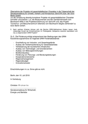 4 Übernahme der Projekte mit gesamtstädtischen Charakter in die Trägerschaft der Senatsverwaltung für Umwelt, Verkehr und Klimaschutz (SenUVK) bzw. der Grün Berlin GmbH, um die Umsetzung derartig komplexer Projekte mit gesamtstädtischen Charakter schneller umzusetzen, u.a. die Museumsinsel und den Gendarmenmarkt vom Bezirksamt Mitte in die Projektdurchführung von SenUVK und das Projekt Tourismus- und Besucherzentrum Glienicke vom Bezirksamt Steglitz-Zehlendorf zu Grün Berlin GmbH. 5. Nach welchen Kriterien können sich die Bezirke GRW-Maßnahmen fördern lassen (insb. notwendige Anzahl der EinwohnerInnen im Fördergebiet, Zeitspanne zwischen beendetem und neu zu beginnendem GRW-Projekt)? Zu 5.: Die Förderung erfolgt entsprechend den Bedingungen des GRW- Koordinierungsrahmens für folgende GRW-Fördertatbestände: - Erschließung von Industrie- und Gewerbegelände - Ausbau der Verkehrsanbindung für Gewerbebetriebe - Verbesserung der touristischen Infrastruktur - Ausbau von Technologie- und Gründerzentren - Ausbau von Bildungseinrichtungen - Breitbandausbau - Förderung von Planungs- und Beratungsleistungen - Kooperationsnetzwerke - Regionalmanagement - Regionalbudget - Innovationscluster Einschränkungen in o.a. Sinne gibt es nicht. Berlin, den 10. Juli 2018 In Vertretung Christian R i c k e r t s .................................................... Senatsverwaltung für Wirtschaft, Energie und Betriebe