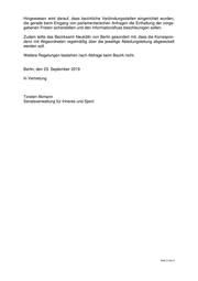 Senatsverwaltung für Inneres und Sport Herrn Abgeordneten Marcel Luthe (FDP) über den Präsidenten des Abgeordnetenhauses von Berlin über Senatskanzlei - G Sen - Antwort auf die Schriftliche Anfrage Nr. 18 / 20 929 vom 9. September 2019 über Regelungen betreffend den Umgang mit Abgeordneten XVI: Bezirksamt Neu- kölln ----------------------------------------------------------------------------------------------------------------- Im Namen des Senats von Berlin beantworte ich Ihre Schriftliche Anfrage wie folgt: 1. Welche speziellen Regelungen/Dienstanweisungen/Vorschriften etc. bestehen bei der oben ge- nannten Behörde und nachgeordneten Einrichtungen, Ämtern und Behörden im Bezug auf den Kon- takt der jeweiligen Stelle und deren Mitarbeitern mit Abgeordneten? 2. Seit wann bestehen diese jeweils? 3. Welchen Inhalt – sofern nicht als VS eingestuft – haben diese genau (bitte Wortlaut)? 4. Sofern diese eingestuft sind, seit wann sind diese eingestuft? Zu 1.- 4.: Nach § 3 Absatz 4 des Allgemeinen Zuständigkeitsgesetzes (AZG) in der Fassung vom 22. Juli 1996 haben sich Senatsverwaltungen, Bezirksämter, Sonderbehörden und nichtrechtsfähige Anstalten gegenseitig von allen wichtigen Ereignissen, Ent- wicklungen und Vorhaben zu unterrichten, die auch für die anderen zur Erfüllung ih- rer Aufgaben von Bedeutung sind (Informationspflicht). Hieraus kann für das Bezirk- samt die Verpflichtung erwachsen, eine Senatsverwaltung über den Kontakt mit Ab- geordneten zu informieren. Darüber hinaus gibt es in den §§ 16 und 17 der Gemeinsamen Geschäftsordnung für die Berliner Verwaltung, Allgemeiner Teil (GGO I) vom 18. Oktober 2011 Regelungen zum Verkehr mit dem Petitionsausschuss des Abgeordnetenhauses von Berlin sowie zum Verfahren beim Akteneinsichtsrecht durch Abgeordnete. Zudem gilt § 1 Absatz 2 der Gemeinsamem Geschäftsordnung für die Berliner Verwaltung, Besonderer Teil (GGO II) vom 8. September 2015. Der Wortlaut der jeweiligen Regelungen ist im In- ternet abrufbar. Seite 1 von 2