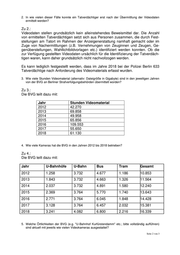 2. In wie vielen dieser Fälle konnte ein Tatverdächtiger erst nach der Übermittlung der Videodaten ermittelt werden? Zu 2.: Videodaten stellen grundsätzlich kein alleinstehendes Beweismittel dar. Die Anzahl von ermittelten Tatverdächtigen setzt sich aus Personen zusammen, die durch Fest- stellungen am Tatort im Rahmen der Anzeigenerstattung namhaft gemacht oder im Zuge von Nachermittlungen (z.B. Vernehmungen von Zeuginnen und Zeugen, Ge- genüberstellungen, Wahllichtbildvorlagen etc.) identifiziert werden konnten. Ob die zur Verfügung gestellten Videodaten ursächlich für die Identifizierung der Tatverdäch- tigen waren, kann daher grundsätzlich nicht nachvollzogen werden. Es kann lediglich festgestellt werden, dass im Jahre 2018 bei der Polizei Berlin 633 Tatverdächtige nach Anforderung des Videomaterials erfasst wurden. 3. Wie viele Stunden Videomaterial (alternativ: Dateigröße in Gigabyte) sind in den jeweiligen Jahren von der BVG an Berliner Strafverfolgungsbehörden übermittelt worden? Zu 3.: Die BVG teilt dazu mit: Jahr Stunden Videomaterial 2012 42.270 2013 69.858 2014 49.958 2015 65.856 2016 109.553 2017 55.650 2018 61.130 4. Wie viele Kameras hat die BVG in den Jahren 2012 bis 2018 betrieben? Zu 4.: Die BVG teilt dazu mit: Jahr U-Bahnhöfe U-Bahn Bus Tram Gesamt 2012 1.258 3.732 4.677 1.186 10.853 2013 1.843 3.732 4.663 1.326 11.564 2014 2.037 3.732 4.891 1.580 12.240 2015 2.369 3.764 5.770 1.740 13.643 2016 2.771 3.764 6.045 1.848 14.428 2017 3.128 3.764 6.457 2.032 15.381 2018 3.241 4.082 6.800 2.216 16.339 5. Welche Örtlichkeiten der BVG (e.g. "U-Bahnhof Kurfürstendamm" etc.; bitte vollständig aufführen) sind aktuell mit jeweils wie vielen Videokameras ausgestattet? Seite 2 von 3
