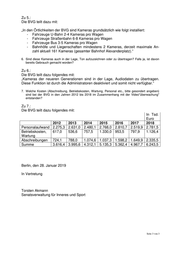Zu 5.: Die BVG teilt dazu mit: „In den Örtlichkeiten der BVG sind Kameras grundsätzlich wie folgt installiert: - Fahrzeuge U-Bahn 2-4 Kameras pro Wagen - Fahrzeuge Straßenbahn 6-8 Kameras pro Wagen - Fahrzeuge Bus 3-5 Kameras pro Wagen - Bahnhöfe und Liegenschaften mindestens 2 Kameras, derzeit maximale An- zahl aktuell 161 Kameras (gesamter Bahnhof Alexanderplatz).“ 6. Sind diese Kameras auch in der Lage, Ton aufzuzeichnen oder zu übertragen? Falls ja, ist davon bereits Gebrauch gemacht worden? Zu 6.: Die BVG teilt dazu folgendes mit: „Kameras der neueren Generationen sind in der Lage, Audiodaten zu übertragen. Diese Funktion ist durch die Administratoren deaktiviert und somit nicht verfügbar.“ 7. Welche Kosten (Abschreibung, Betriebskosten, Wartung, Personal etc., bitte gesondert angeben) sind bei der BVG in den Jahren 2012 bis 2018 im Zusammenhang mit der Video"überwachung" entstanden? Zu 7.: Die BVG teilt dazu folgendes mit: In Tsd. Euro 2012 2013 2014 2015 2016 2017 2018 Personalaufwand 2.275,3 2.631,0 2.480,1 2.768,0 2.810,7 2.519,9 2.781,5 Betriebskosten, 617,0 536,6 757,5 1.330,0 953,5 797,9 1.126,4 Wartung Abschreibungen 724,1 788,0 1.074,6 1.037,3 1.598,2 1.649,9 2.335,5 Summe 3.616,4 3.995,6 4.312,1 5.135,3 5.362,4 4.967,7 6.243,5 Berlin, den 28. Januar 2019 In Vertretung Torsten Akmann Senatsverwaltung für Inneres und Sport Seite 3 von 3
