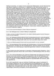 2 Haftraum einschloss, um sodann mit den anwesenden Bediensteten und der Alarmzentrale das weitere Vorgehen zu koordinieren. In Absprache mit der Alarmzentrale wurden zu- nächst vier weitere Bedienstete aus den anderen Teilanstalten zusammengezogen, um die drei diensthabenden Bediensteten des Hauses A bei der Verbringung in den BgH zu unter- stützen. Gegen 20:40 Uhr wurde der bereits schlafende Gefangene nochmals durch die Schichtleitung angesprochen. Daraufhin wiederholte dieser zwar, dass er nach Heidering verlegt werden wolle, distanzierte sich aber auf Nachfrage klar davon, sich selbst verletzten oder suizidieren zu wollen. In Absprache zwischen den entscheidungsbefugten Mitarbeiten- den der Alarmzentrale sowie Mitarbeitenden der Schichtleitung wurde daraufhin entschie- den, den Gefangenen in seinem Haftraum zu belassen und es wurde eine unregelmäßige nächtliche Beobachtung angeordnet. Der klare und geordnete Eindruck, den der Gefangene im Gespräch hinterließ, mit der Perspektive, am nächsten Werktag mit dem Sozialdienst seine Probleme besprechen zu können, ließen die Beamten, die ihre Entscheidung in Ab- stimmung mit dem Schichtleiter trafen, zu der nachvollziehbaren Annahme einer nicht mehr bestehenden akuten Suidzidgefahr gelangen. Somit bestand keine Veranlassung für sie, dem Gefangenen gefährliche Gegenstände, wie seinen Gürtel, zu entziehen. Gegen 22:30 Uhr erfolgte die erste Kontrolle des Gefangenen, wobei dieser schlafend aufgefunden wur- de und auf Ansprache reagierte. 5. Wo und wie war der/die Gefangene zu diesem Zeitpunkt untergebracht? Zu 5.: Der Gefangene war in seinem Haftraum untergebracht. 6. Gab es, und wenn ja: welche Anhaltspunkte für eine mögliche Selbsttötungsabsicht des/der Gefangenen und wer hat diese festgestellt? Zu 6.: Der Gefangene äußerte während einer Kontrolluntersuchung im Justizvollzugskran- kenhaus in der JVA Plötzensee der diensthabenden Ärztin gegenüber, dass er umgehend in die JVA Heidering verlegt werden wolle, da er sich ansonsten etwas antun werde. 7. Sofern eine Selbsttötungsabsicht erkannt wurde: was wurde daraufhin von wem veranlasst? Zu 7.: Die diensthabende Ärztin beurteilte die Suizidmotivation im Sinne eines demonstrativ- erpresserischen Verhaltens bei dem Strafgefangenen. Dennoch empfahl sie aus vollzugli- chen Gründen eine Unterbringung im besonders gesicherten Haftraum mit Monitorüberwa- chung. 8. Gab es ärztliche oder andere Anweisungen zur besonderen Unterbringung des/der Gefangenen, z. Bsp. in einem besonders gesicherten Haftraum oder in einem Haftraum mit Mehrfachbelegung? Wenn nein: Warum nicht? Zu 8.: Die im Dienst befindlichen sehr erfahrenen Bediensteten des allgemeinen Vollzugs- dienstes sind von der ärztlichen Empfehlung abgewichen, weil sich der Gefangene auf Nachfrage den Bediensteten gegenüber klar davon distanzierte, sich selbst zu verletzen oder zu suizidieren. In diesem Gespräch gewannen die Bediensteten den Eindruck, dass dies glaubhaft sei. Es ist nicht ungewöhnlich, dass von ärztlichen Empfehlungen aufgrund veränderter Er- kenntnislagen abgewichen wird. Die Unterbringung eines Strafgefangenen in den beson- ders gesicherten Haftraum ist stets ultima Ratio. Daher besteht seitens der Bediensteten des allgemeinen Vollzugsdienstes nicht nur das Recht, sondern auch die Verpflichtung zur regelmäßigen Überprüfung vollzuglicher Sicherungsmaßnahmen.