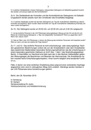 3 9. In welchen Zeitabständen müssen Gefangene, insbesondere Gefangene mit Selbsttötungsabsicht kontrol- liert werden und woraus ergibt sich die Kontrolldichte? Zu 9.: Die Zeitabstände der Kontrollen und die Kontrolldichte bei Gefangenen mit Selbsttö- tungsabsicht werden jeweils nach den Umständen des Einzelfalles festgelegt. 10. In welchen Abständen wurden bei dem/der Gefangenen am Tag der mutmaßlichen Selbsttötung Lebend- kontrollen durchgeführt? Wann wurden diese Kontrollen am Tag der mutmaßlichen Selbsttötung erstmalig und wann zuletzt durchgeführt? Zu 10.: Der Gefangene wurde um 20:40 Uhr, um 22:30 Uhr und um 2:45 Uhr aufgesucht. 11. Ist das ärztliche Personal in der JVA Plötzensee weisungsbefugt in Bezug auf den Ort und die Art und Weise der Unterbringung Gefangener, z. Bsp. bei festgestellter Suizidabsicht? Wenn ja: gegenüber wem? Wenn nein: warum nicht? 12. Gab es Fälle in der JVA Plötzensee, in denen die Weisung des ärztlichen Personals nicht beachtet wurde? Wenn ja: wann und was war jeweils die Folge dessen? Zu 11. und 12.: Das ärztliche Personal ist nicht entscheidungs- oder weisungsbefugt. Nach den gesetzlichen Bestimmungen ordnen die von der Anstaltsleiterin oder dem Anstaltsleiter dazu bestimmten Bediensteten besondere Sicherungsmaßnahmen wie die Unterbringung in einem besonders gesicherten Haftraum an (§ 87 Abs. 1 Satz 1 des Strafvollzugsgesetzes Berlin). In Alarmfällen zur Nachtzeit sind dies nach den in den Berliner Haftanstalten gelten- den Weisungslagen die Beamtinnen und Beamten der Alarmzentrale. Die Anstaltsärzte ha- ben insoweit keine Entscheidungskompetenz. Ihnen kommt lediglich eine beratende Funkti- on zu. Fälle, in denen von einer ärztlichen Empfehlung etwa aufgrund einer veränderten Sachlage abgewichen wird, sind im vollzuglichen Alltag nicht unüblich. Allerdings werden hierüber in der JVA Plötzensee keine Aufzeichnungen geführt. Berlin, den 28. November 2018 In Vertretung M. Gerlach Senatsverwaltung für Justiz, Verbraucherschutz und Antidiskriminierung