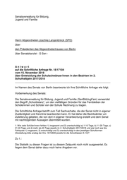 Senatsverwaltung für Bildung, Jugend und Familie Herrn Abgeordneten Joschka Langenbrinck (SPD) über den Präsidenten des Abgeordnetenhauses von Berlin über Senatskanzlei - G Sen - Antwort auf die Schriftliche Anfrage Nr. 18/17104 vom 15. November 2018 über Entwicklung der Schulschwänzer/innen in den Bezirken im 2. Schulhalbjahr 2017/2018 ___________________________________________________________________ Im Namen des Senats von Berlin beantworte ich Ihre Schriftliche Anfrage wie folgt: Vorbemerkung des Senats: Die Senatsverwaltung für Bildung, Jugend und Familie (SenBildJugFam) verwendet den Begriff „Schuldistanz“, um den vielfältigen Gründen für das Fernbleiben der Schülerinnen und Schüler von der Schule Rechnung zu tragen. Die Schriftliche Anfrage betrifft zum Teil Sachverhalte, die der Senat nicht in eigener Zuständigkeit und Kenntnis beantworten kann. Er hat daher die Bezirksämter um Zulieferung gebeten, die von dort in eigener Verantwortung erstellt und dem Senat mit nachfolgenden Aussagen übermittelt wurden. 1. Wie viele Schüler/innen fehlten 1) insgesamt und 2) unentschuldigt a) 1-10 Tage, b) 11-20 Tage, c) 21-40 Tage und d) mehr als 40 Tage jeweils im 2. Schulhalbjahr 2017/2018 und wie hoch war die Fehlquote 1) insgesamt, 2) entschuldigt und 3) unentschuldigt in den jeweiligen Schulformen (Darstellung bitte analog der Drs. 18/12840 jeweils für die Schulklassen 5-10)? Zu 1.: Die Statistik zu diesen Fragen ist zu diesem Zeitpunkt noch nicht ausgewertet. Es liegen dem Senat daher dazu noch keine Angaben vor.