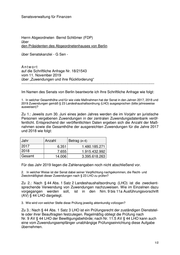 Senatsverwaltung für Finanzen Herrn Abgeordneten Bernd Schlömer (FDP) über den Präsidenten des Abgeordnetenhauses von Berlin über Senatskanzlei - G Sen - Antwort auf die Schriftliche Anfrage Nr. 18/21543 vom 11. November 2019 über „Zuwendungen und ihre Rückforderung“ -------------------------------------------------------------------------------------------------------------- Im Namen des Senats von Berlin beantworte ich Ihre Schriftliche Anfrage wie folgt: 1. In welcher Gesamthöhe und für wie viele Maßnahmen hat der Senat in den Jahren 2017, 2018 und 2019 Zuwendungen gemäß § 23 Landeshaushaltsordnung (LHO) ausgesprochen (bitte jahresweise ausweisen)? Zu 1.: Jeweils zum 30. Juni eines jeden Jahres werden die im Vorjahr an juristische Personen vergebenen Zuwendungen in der zentralen Zuwendungsdatenbank veröf- fentlicht. Entsprechend der veröffentlichten Daten ergeben sich die Anzahl der Maß- nahmen sowie die Gesamthöhe der ausgereichten Zuwendungen für die Jahre 2017 und 2018 wie folgt: Jahr Anzahl Betrag (in €) 2017 6.351 1.480.185.271 2018 7.655 1.915.432.992 Gesamt 14.006 3.395.618.263 Für das Jahr 2019 liegen die Zahlenangaben noch nicht abschließend vor. 2. In welcher Weise ist der Senat dabei seiner Verpflichtung nachgekommen, die Recht- und Zweckmäßigkeit dieser Zuwendungen nach § 23 LHO zu prüfen? Zu 2.: Nach § 44 Abs. 1 Satz 2 Landeshaushaltsordnung (LHO) ist die zweckent- sprechende Verwendung von Zuwendungen nachzuweisen. Wie im Einzelnen dazu vorgegangen werden soll, ist in den Nrn. 9 bis 11a Ausführungsvorschrift (AV) § 44 LHO dargelegt. 3. Wie wird von welcher Stelle diese Prüfung jeweilig aktenkundig vollzogen? Zu 3.: Nach § 44 Abs. 1 Satz 3 LHO ist ein Prüfungsrecht der zuständigen Dienststel- le oder ihrer Beauftragten festzulegen. Regelmäßig obliegt die Prüfung nach Nr. 9 AV § 44 LHO der Bewilligungsbehörde; nach Nr. 11.5 AV § 44 LHO kann auch eine vom Zuwendungsempfänger unabhängige Prüfungseinrichtung diese Aufgabe übernehmen. 1/2