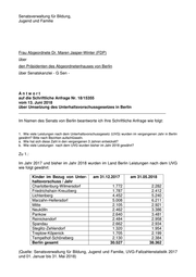Senatsverwaltung für Bildung, Jugend und Familie Frau Abgeordnete Dr. Maren Jasper-Winter (FDP) über den Präsidenten des Abgeordnetenhauses von Berlin über Senatskanzlei - G Sen - Antwort auf die Schriftliche Anfrage Nr. 18/15355 vom 13. Juni 2018 über Umsetzung des Unterhaltsvorschussgesetzes in Berlin ___________________________________________________________________ Im Namen des Senats von Berlin beantworte ich Ihre Schriftliche Anfrage wie folgt: 1. Wie viele Leistungen nach dem Unterhaltsvorschussgesetz (UVG) wurden im vergangenen Jahr in Berlin gewährt? Bitte nach Bezirken aufschlüsseln. a. Wie hat sich diese Zahl in den vergangenen 3 Jahren entwickelt? b. Wie viele Leistungen nach dem UVG wurden bisher im Jahr 2018 gewährt? Zu 1.: Im Jahr 2017 und bisher im Jahr 2018 wurden im Land Berlin Leistungen nach dem UVG wie folgt gewährt: Kinder im Bezug von Unter- am 31.12.2017 am 31.05.2018 haltsvorschuss / Jahr Charlottenburg-Wilmersdorf 1.772 2.282 Friedrichshain-Kreuzberg 1.787 2.412 Lichtenberg 4.452 5.240 Marzahn-Hellersdorf 5.008 6.211 Mitte 2.105 2.921 Neukölln 2.462 3.386 Pankow 2.640 3.481 Reinickendorf 2.484 2.958 Spandau 2.662 2.934 Steglitz-Zehlendorf 1.320 1.954 Treptow-Köpenick 1.705 2.199 Tempelhof-Schöneberg 2.130 2.384 Berlin gesamt 30.527 38.362 (Quelle: Senatsverwaltung für Bildung, Jugend und Familie, UVG-Fallzahlenstatistik 2017 und 01. Januar bis 31. Mai 2018)