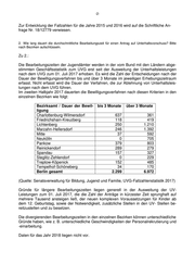 -2- Zur Entwicklung der Fallzahlen für die Jahre 2015 und 2016 wird auf die Schriftliche An- frage Nr. 18/12779 verwiesen. 2. Wie lang dauert die durchschnittliche Bearbeitungszeit für einen Antrag auf Unterhaltsvorschuss? Bitte nach Bezirken aufschlüsseln. Zu 2.: Die Bearbeitungszeiten der Jugendämter werden in der vom Bund mit den Ländern abge- stimmten Geschäftsstatistik zum UVG erst seit der Ausweitung der Unterhaltsleistungen nach dem UVG zum 01. Juli 2017 erhoben. Es wird die Zahl der Entscheidungen nach der Dauer der Bewilligungsverfahren bis und über 3 Monate im jeweiligen Erhebungszeitraum erfasst. Nicht erfasst wird die Dauer der Verfahren, die zur Ablehnung von Unterhaltsleis- tungen nach dem UVG führen. Im zweiten Halbjahr 2017 dauerten die Bewilligungsverfahren nach diesen Kriterien in den einzelnen Bezirken wie folgt: Bezirksamt / Dauer der Bewil- bis 3 Monate über 3 Monate ligung Charlottenburg-Wilmersdorf 637 361 Friedrichshain-Kreuzberg 118 419 Lichtenberg 250 1.210 Marzahn-Hellersdorf 246 1.392 Mitte 37 592 Neukölln 0 705 Pankow 379 803 Reinickendorf 289 279 Spandau 157 327 Steglitz-Zehlendorf 0 229 Treptow-Köpenick 152 485 Tempelhof-Schöneberg 34 170 Berlin gesamt 2.299 6.972 (Quelle: Senatsverwaltung für Bildung, Jugend und Familie, UVG-Fallzahlenstatistik 2017) Gründe für längere Bearbeitungszeiten liegen generell in der Ausweitung der UV- Leistungen zum 01. Juli 2017, die die Zahl der Anträge in kürzester Zeit sprunghaft auf mehrere Tausend ansteigen ließ, der neuen komplexen Voraussetzungen für Kinder ab dem 12. Geburtstag, sowie der Notwendigkeit, zusätzliche Stellen in den UV- Stellen be- reitzustellen und zu besetzen. Die divergierenden Bearbeitungszeiten in den einzelnen Bezirken können unterschiedliche Gründe haben, wie z. B. unterschiedliche Geschwindigkeiten der Personalrekrutierung und -einarbeitung. Daten für das Jahr 2018 liegen nicht vor.