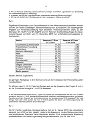 -3- 3. Wie viel Personal (Vollzeitäquivalente) steht den jeweiligen bezirklichen Jugendämtern zur Bearbeitung von Unterhaltsleistungen zur Verfügung? a. Ist geplant, die Zahl der in den bezirklichen Jugendämtern besetzten Stellen zu erhöhen? b. Wie hat sich die Zahl der Vollzeitäquivalente in den vergangenen 3 Jahren entwickelt? Zu 3.: Regelhafte Erhebungen zum Personalbestand in den Unterhaltsvorschussstellen werden von der für Familie zuständigen Senatsverwaltung nicht durchgeführt. Die nachfolgenden Angaben zur Personalausstattung nach besetzten Vollzeitäquivalenten (VZÄ) zu den Stichtagen 31.12.2017 und 31.05.2018 sind im Rahmen des Berichtsauftrags des Abge- ordnetenhauses von Berlin vom 14. Dezember 2017 zum Unterhaltsvorschussgesetz er- fasst worden. Bezirk Besetzte VZÄ am Besetzte VZÄ am 31.12.2017 31.05.2018 Charlottenburg-Wilmersdorf 11,60 9,60 Friedrichshain-Kreuzberg 11,85 13,89 Lichtenberg 21,00 22,00 Marzahn-Hellersdorf 18,49 17,49 Mitte 19,43 24,24 Neukölln 21,26 19,37 Pankow 22,75 22,75 Reinickendorf 14,88 16,00 Spandau 15,10 19,00 Steglitz-Zehlendorf 12,61 13,61 Treptow-Köpenick 15,00 16,00 Tempelhof-Schöneberg 10,75 20,75 Berlin gesamt 194,72 197,21 (Quelle: Bezirke, Jugendamt) Die geringen Rückgänge in drei Bezirken sind auf den Tatbestand der Personalfluktuation zurückzuführen. Zur VZÄ vor dem 31.12.2017 wird im Übrigen wird auf die Antwort zu den Fragen 8. und 9. auf die Schriftliche Anfrage Nr. 18/12779 verwiesen. 4. Hat die Senatsverwaltung für Bildung, Jugend und Familie das Informationsblatt über das UVG für Eltern zeitnah an die zum 1.1.2018 geänderte Bundesrichtlinie hinsichtlich des Betreuungsumfangs und dessen Auswirkung auf den Anspruch auf Unterhaltsvorschuss zur Umsetzung des UVG angepasst? Wie viele Anträge nach dem UVG wurden bis zum 31.3.2018 gestellt, bei denen der Betreuungsumfang des familienfernen Elternteils zwischen 33 und 50% liegt? Zu 4.: Die für Familie zuständige Senatsverwaltung hat am 2. Januar 2018 das aktualisierte Merkblatt zum UVG ins Netz gestellt. Leider ist die Anpassung zu dem Betreuungsumfang des familienfernen Elternteils dabei übersehen worden. Eine entsprechende Anpassung des Merkblattes zum Betreuungsumfang erfolgte deshalb erst zum 08. Mai 2018.