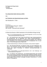 Der Regierende Bürgermeister von Berlin - Senatskanzlei – Frau Abgeordnete Katalin Gennburg (LINKE) über den Präsidenten des Abgeordnetenhauses von Berlin über Senatskanzlei – G Sen – Antwort auf die Schriftliche Anfrage Nr. 18/20011 vom 21. Juni 2019 über CityLAB – Raumschiff oder Gemeingut? ___________________________________________________________________ Im Namen des Senats von Berlin beantworte ich Ihre Schriftliche Anfrage wie folgt: 1. Wer ist in die Entscheidungsprozesse um das CityLAB eingebunden, und wie und wo finden welche Entscheidungsprozesse konkret statt? Zu 1.: Die Federführung für das Projekt CityLAB Berlin liegt verwaltungsseitig bei der Senatskanzlei, die im Bedarfsfall auch weitere Senatsverwaltungen in Entscheidungsprozesse einbezieht. In Umsetzung der Aufgaben, die im Rahmen einer Zuwendung an die Technologiestiftung Berlin übergegangen sind, ist auch diese in Entscheidungsprozesse eingebunden. 2. Welche Senatsverwaltungen und Bezirke sind einbezogen und was sind deren Aufgaben? Zu 2.: Alle Senatsverwaltungen und Bezirke wurden und sind aufgefordert, sich aktiv an der Einrichtung und dem Betrieb des CityLAB Berlin zu beteiligen und hierbei auch eigene Vorschläge für inhaltliche Schwerpunktsetzungen zu unterbreiten. 3. Welche wissenschaftlichen und cutting-edge-Institutionen sind in den Entstehungs- und Entwicklungsprozess eingebunden? Zu 3.: Im Rahmen des Entstehungs- und Entwicklungsprozesses des CityLAB Berlin wurden bislang zahlreiche verschiedenartige Institutionen beteiligt, darunter u.a. die Technologiestiftung Berlin, die Technische Universität Berlin, das Einstein Center Digital Future, die Open Knowledge Foundation Deutschland e.V. und die Berliner Energieagentur. 1