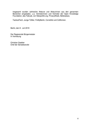 Insgesamt wurden zahlreiche Akteure und Akteurinnen aus den genannten Bereichen eingeladen, u.a. Vertreterinnen und Vertreter der Open Knowledge Foundation, des FabLab, von Netzpolitik.org, PrivacyWeek, Betterplace, TacticalTech, Junge Tüftler, FixMyBerlin, CorrelAid und CoWomen. Berlin, den 8 . Juli 2019 Der Regierende Bürgermeister In Vertretung Christian Gaebler Chef der Senatskanzlei 4