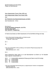 Drucksache 18 / 17 773 Schriftliche Anfrage 18. Wahlperiode Schriftliche Anfrage der Abgeordneten Tommy Tabor und Franz Kerker (AfD) vom 29. Januar 2019 (Eingang beim Abgeordnetenhaus am 06. Februar 2019) zum Thema: Neukölln: Pflegebetrug und Antwort vom 20. Februar 2019 (Eingang beim Abgeordnetenhaus am 22. Feb. 2019) Die Drucksachen des Abgeordnetenhauses sind bei der Kulturbuch-Verlag GmbH zu beziehen. Hausanschrift: Sprosserweg 3, 12351 Berlin-Buckow · Postanschrift: Postfach 47 04 49, 12313 Berlin, Telefon: 6 61 84 84; Telefax: 6 61 78 28.