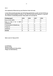 -2- Zu 3.: Eine statistische Differenzierung nach Bezirken findet nicht statt. In dem Aktenverwaltungssystem der Strafverfolgungsbehörden wurden seit der Einführung der Nebenverfahrensklasse PFLEGE im Jahr 2015 bis Ende 2018 insgesamt 13 gerichtli- che Verfahren rechtskräftig beendet. Diese stellen sich wie folgt dar: Erledigungsart 2015 2016 2017 2018 Einst. § 153 II StPO 0 1 0 0 Einst. § 153a II Nr. 2 StPO 0 1 0 2 (Geldbetrag) Freiheitsstrafe mit Bewährung 2 0 0 1 Freispruch 0 2 0 0 Geldstrafe 0 0 3 1 Summe 2 4 3 4 Berlin, den 20. Februar 2019 In Vertretung Barbara König Senatsverwaltung für Gesundheit, Pflege und Gleichstellung