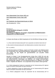 Senatsverwaltung für Bildung, Jugend und Familie Herrn Abgeordneten Franz Kerker (AfD) und Herrn Abgeordneten Tommy Tabor (AfD) über den Präsidenten des Abgeordnetenhauses von Berlin über Senatskanzlei - G Sen - Antwort auf die Schriftliche Anfrage Nr. 18/18732 vom 30.04.2019 über Bildung für Mädchen und Jungen: Jungenarbeit und Mädchenarbeit – Jungenpolitik und Mädchenpolitik ___________________________________________________________________ Im Namen des Senats von Berlin beantworte ich Ihre Schriftliche Anfrage wie folgt: 1.) a.) Was versteht die Senatsverwaltung BJF unter Jungenarbeit und welchem Zweck dient sie? b.) Was versteht die Senatsverwaltung BJF unter Mädchenarbeit und welchem Zweck dient sie? Zu 1. a.) und b.): Die Senatsverwaltung für Bildung, Jugend und Familie versteht unter Mädchenarbeit und Jungenarbeit eine geschlechterreflektierte pädagogische Arbeit mit Mädchen und Jungen, die den Aspekt der geschlechtlichen und sexuellen Vielfalt berücksichtigt. Gemäß § 9 Absatz 3 des Sozialgesetzbuches Achtes Buch (SGB VIII) sind alle Leistungen und Angebote in der Kinder- und Jugendhilfe so auszugestalten, dass sie die unterschiedlichen Lebenslagen von Mädchen und Jungen berücksichtigen, Benachteiligungen abbauen und die Gleichberechtigung von Mädchen und Jungen fördern. Angebote der Mädchen- und Jungenarbeit sind auf diesen Zweck gerichtet. 2.) a.) Welche pädagogischen Ansätze der Jungenarbeit sind der Senatsverwaltung BJF allgemein bekannt und wodurch unterscheiden sich diese voneinander? b.) Welche pädagogischen Ansätze der Mädchenarbeit sind der Senatsverwaltung BJF allgemein bekannt und wodurch unterscheiden sich diese voneinander? 3.) a.) Welchen pädagogischen Ansatz der Jungenarbeit hält die Senatsverwaltung BJF für