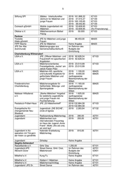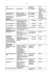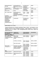 5 Stiftung SPI Mädea - Interkulturelles 2018: 161.868,32 67103 Zentrum für Mädchen und 2018: 37.015,37 67139 junge Frauen 2019: 165.105,65 67103 2019: 38.042,80 67139 Outreach gGmbH Mobile Jugendarbeit mit 2018: 53.609,95 67103 Mädchen 2019: 53.609,95 (Ko-Finanzierung) Ottokar e.V. Mädchenzentrum Bärbel 2019: 50.000 67103 Patzig Pankow Tivolotte JFE für Mädchen und junge 88.453,00 68425 Kilele gGmbH Frauen FIPP Nische JFE für Mädchen Keine Angabe 68425 JFE Der Alte Mädchengruppe aus Im Rahmen des (kommunal) Gemeinschaftsunterkunft Budgets der Einrichtung Charlottenburg-Wilmersdorf LiSA e.V. JFE „Offener Mädchen- und 2018: 92.628,54 67103 Frauentreff mit spezifischen 2019: 92.628,54 Angeboten LiSA e.V. Mädchenorientiertes 2018: 23.510,99 67103 Freizeitgelände „Jackie“ am 2019: 23.510,99 Jakob-Kaiser-Platz LiSA e.V. Mädchen-AG, sportliche 2018: 1.100,00 68425 und kulturelle Angebote für 2019: 8.000,00 68425 geflüchtete Mädchen und (auftragsweise junge Frauen Bewirtschaftung der Mittel) Friedenskirchen Mädchenangebote für 2018: 11.183,00 68425 Charlottenburg Geflüchtete: Bildungs- und (auftragsweise Sportangebote Bewirtschaftung der Mittel) Malteser Hilfsdienst „Starke Mädchen“ Angebot 2018: 1.625,00 68425 e.V. für weibliche Jugendliche (auftragsweise und junge Frauen mit Bewirtschaftung der Fluchterfahrung Mittel) Pestalozzi-Fröbel-Haus JFE „D3 Mädchentreff“ 2018:132.984,58 67103 2019:132.984,58 Evangelische Kir- Jugendclub „DIE EICHE“, 2019: 2.283,84 67132 chengemeinde Neu- circle of tigress Westend Jugendamt Radiosendung Mädchentag 2018: 280,00 42701 Jugendamt Mädchenfest zum 2019: 200,00 42701 internationalen Frauentag im Haus der Jugend „Anne Frank“; Motto „We are one, wir sind laut“ Jugendamt in Ko- Kalender-Erarbeitung 2019: 810,00 42701 operation mit Trä-gern Mädchentag der freien Ju-gendhilfe Jugendamt Girlsday Keine Angabe Steglitz-Zehlendorf Rasselbande e.V. Girls‘ Day 1.250,00 67101 Jugendamt/JFE Street Dance, Girls‘ Club, Im Rahmen des 42701 Albrecht Dürer Mädchenzeit Budgets der 53401 Einrichtung Mittelhof e.V. Kung Fu Keine Angabe 67101 Mittelhof e.V. Klettern f. Mädchen Keine Angabe 67101 Mittelhof e.V. Mädchennachmittag Keine Angabe 67101 Jugendamt/ JFE Dr. Street Dance Im Rahmen des 42701