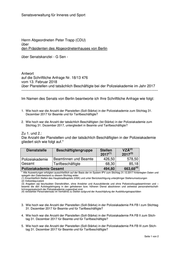 Senatsverwaltung für Inneres und Sport Herrn Abgeordneten Peter Trapp (CDU) über den Präsidenten des Abgeordnetenhauses von Berlin über Senatskanzlei - G Sen - Antwort auf die Schriftliche Anfrage Nr. 18/13 476 vom 13. Februar 2018 über Planstellen und tatsächlich Beschäftigte bei der Polizeiakademie im Jahr 2017 ----------------------------------------------------------------------------------------------------------------- Im Namen des Senats von Berlin beantworte ich Ihre Schriftliche Anfrage wie folgt: 1. Wie hoch war die Anzahl der Planstellen (Soll-Stärke) in der Polizeiakademie zum Stichtag 31. Dezember 2017 für Beamte und für Tarifbeschäftigte? 2. Wie hoch war die Anzahl der tatsächlich Beschäftigten (Ist-Stärke) in der Polizeiakademie zum Stichtag 31. Dezember 2017, untergliedert in Beamte und Tarifbeschäftigte? Zu 1. und 2.: Die Anzahl der Planstellen und der tatsächlich Beschäftigten in der Polizeiakademie gliedert sich wie folgt auf.* (2) Dienststelle Beschäftigtengruppe Stellen VZÄ (1) (3) 2017 2017 Polizeiakademie Beamtinnen und Beamte 426,50 578,50 Gesamt Tarifbeschäftigte 68,30 85,18 (4) Polizeiakademie Gesamt 494,80 663,68 * Alle Auswertungen erfolgten ausschließlich auf der Basis der im System IPV zum Stichtag 31.12.2017 hinterlegten Daten und spiegeln den Datenbestand zu diesem Stichtag wider. (1) Einschließlich Stellen des Hauptstadtkapitels (HSK) und unter Berücksichtigung unterjähriger Stellenumsetzungen (2) Vollzeitäquivalent (3) Angaben mit beurlaubten Dienstkräften, ohne Anwärter und Auszubildende und ohne Polizeivollzugsbeamtinnen und – beamte die den Aufstiegslehrgang in den gehobenen bzw. höheren Dienst absolvieren und zeitweise personalwirtschaft- lich/organisatorisch der Polizeiakademie zugeordnet sind. (4) verstärkter Personaleinsatz im Verhältnis zu Stellen aufgrund der Ausschöpfung der Ausbildungskapazitäten 3. Wie hoch war die Anzahl der Planstellen (Soll-Stärke) in der Polizeiakademie PA FB I zum Stichtag 31. Dezember 2017 für Beamte und für Tarifbeschäftigte? 4. Wie hoch war die Anzahl der Planstellen (Soll-Stärke) in der Polizeiakademie PA FB II zum Stich- tag 31. Dezember 2017 für Beamte und für Tarifbeschäftigte? 5. Wie hoch war die Anzahl der Planstellen (Soll-Stärke) in der Polizeiakademie PA FB III zum Stich- tag 31. Dezember 2017 für Beamte und für Tarifbeschäftigte? Seite 1 von 2