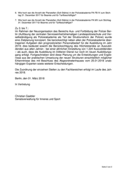 6. Wie hoch war die Anzahl der Planstellen (Soll-Stärke) in der Polizeiakademie PA FB IV zum Stich- tag 31. Dezember 2017 für Beamte und für Tarifbeschäftigte? 7. Wie hoch war die Anzahl der Planstellen (Soll-Stärke) in der Polizeiakademie PA MV zum Stichtag 31. Dezember 2017 für Beamte und für Tarifbeschäftigte? Zu 3. bis 7.: Im Rahmen der Neuorganisation des Bereichs Aus- und Fortbildung der Polizei Ber- lin (Auflösung der zentralen Serviceeinheit/ehemaligen Landespolizeischule und Ver- selbständigung als Polizeiakademie als Teil der Strukturreform der Polizei) wurde eine Zielplanung konzipiert. Sie berücksichtigt neben allen der Polizeiakademie über- tragenen Aufgaben den prognostizierten Personalbedarf für die Ausbildung im Jahr 2019; dies bedeutet sowohl die Berücksichtigung des Höchststandes an Auszubil- denden aus allen Jahren - bei einer jährlichen Einstellung von 1.224 Auszubildenden – als auch, dass die Ausbildung im mittleren Dienst nur noch im neuen Ausbildungs- gang erfolgt. Fortgeschrieben wird diese Planung um die Entwicklungen und Ergeb- nisse aus der praktischen Umsetzung der neuen Strukturen einschließlich möglicher Erkenntnisse des mit Beschluss des Abgeordnetenhauses vom 25.01.2018 unab- hängigen Experten sowie weiterer Entscheidungen. Die Zuordnung der einzelnen Stellen zu den Fachbereichen erfolgt im Laufe des Jah- res 2018. Berlin, den 01. März 2018 In Vertretung Christian Gaebler Senatsverwaltung für Inneres und Sport Seite 2 von 2