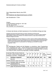 Senatsverwaltung für Inneres und Sport Herrn Abgeordneten Marcel Luthe (FDP) über den Präsidenten des Abgeordnetenhauses von Berlin über Senatskanzlei - G Sen - Antwort auf die Schriftliche Anfrage Nr. 18/13 182 vom 08. Januar 2018 über Straftaten zum Jahreswechsel ----------------------------------------------------------------------------------------------------------------- Im Namen des Senats von Berlin beantworte ich Ihre Schriftliche Anfrage wie folgt: Anlässlich der Sitzung des Ausschusses für Inneres, Sicherheit und Ordnung des Abgeordnetenhauses von Berlin am heutigen Tage hat der Senator für Inneres und Sport detailliert über Straftaten im Bereich der Direktion 3 an Silvester berichtet, so dass diese Aufstellung ohne Weiteres verfügbar sein dürfte. 1) Wie viele Straftaten sind mit einer Tatzeit am 31.12.2017 und 01.01.2018 im örtlichen Bereich der jeweiligen Polizeidirektionen (auch bei Bearbeitung durch DIR Einsatz/LKA/Bundespolizei/sonstige) in Berlin aktuell erfasst worden? (Bitte gruppiert nach den PKS-Hauptgruppen im Sinne der PKS 2016 und unter gesonderter Ausweisung der als "Beleidigung auf sexueller Grundlage" eingestuften Taten.) Zu 1.: Der nachfolgenden Tabelle sind die Straftaten zu entnehmen, deren Tatzeitanfang am 31. Dezember 2017 oder 1. Januar 2018 lag. Bei der Auswertung handelt es sich um verlaufsstatistische Angaben, d.h. es werden bei der Anzahl der Fälle nur die bis zum Zeitpunkt dieser Auswertung angezeigten Straftaten abgebildet. Anzahl der Fälle mit einer Tatzeit am Dir Dir Dir Dir Dir Dir ohne 31.12.2017 und 01.01.2018 nach Tatort- Gesamt 1 2 3 4 5 6 Angabe direktionen und PKS*) - Hauptgruppen ------ Straftaten insgesamt 390 403 681 383 656 363 104 2980 darunter 000000 Straftaten gegen das Leben - - - - - - - - Straftaten gegen die sexuelle 100000 2 - 19 4 5 3 2 35 Selbstbestimmung Rohheitsdelikte und Straftaten 200000 90 82 136 48 114 97 6 573 gegen die persönliche Freiheit Seite 1 von 2