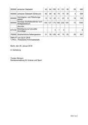 300000 einfacher Diebstahl 43 64 159 31 131 36 29 493 400000 schwerer Diebstahl (Einbruch) 62 69 42 74 73 35 4 359 Vermögens- und Fälschungs- 500000 12 12 20 11 23 8 19 105 delikte Sonstige Straftatbestände nach 600000 150 137 173 169 232 164 15 1040 Strafgesetzbuch darunter Beleidigung auf sexueller 673100 - - 4 1 3 - - 8 Grundlage 700000 Strafrechtliche Nebengesetze 31 39 128 45 75 20 29 367 DWH-FI vom 22.01.2018 *) PKS = Polizeiliche Kriminalstatistik Berlin, den 25. Januar 2018 In Vertretung Torsten Akmann Senatsverwaltung für Inneres und Sport Seite 2 von 2
