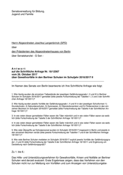 Drucksache 18 / 12 567 Schriftliche Anfrage 18. Wahlperiode Schriftliche Anfrage des Abgeordneten Joschka Langenbrinck (SPD) vom 26. Oktober 2017 (Eingang beim Abgeordnetenhaus am 26. Oktober 2017) zum Thema: Gewaltvorfälle in den Berliner Schulen im Schuljahr 2016/2017 II und Antwort vom 13. November 2017 (Eingang beim Abgeordnetenhaus am 15. Nov. 2017) Die Drucksachen des Abgeordnetenhauses sind bei der Kulturbuch-Verlag GmbH zu beziehen. Hausanschrift: Sprosserweg 3, 12351 Berlin-Buckow · Postanschrift: Postfach 47 04 49, 12313 Berlin, Telefon: 6 61 84 84; Telefax: 6 61 78 28.