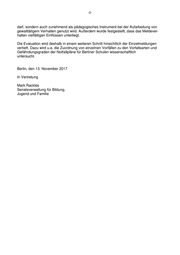 -2- darf, sondern auch zunehmend als pädagogisches Instrument bei der Aufarbeitung von gewalttätigem Verhalten genutzt wird. Außerdem wurde festgestellt, dass das Meldever- halten vielfältigen Einflüssen unterliegt. Die Evaluation wird deshalb in einem weiteren Schritt hinsichtlich der Einzelmeldungen vertieft. Dazu wird u.a. die Zuordnung von einzelnen Vorfällen zu den Vorfallsarten und Gefährdungsgraden der Notfallpläne für Berliner Schulen wissenschaftlich untersucht. Berlin, den 13. November 2017 In Vertretung Mark Rackles Senatsverwaltung für Bildung, Jugend und Familie