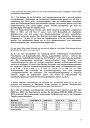 7. Was passiert(e) mit Zuweisungen, die nicht für die Schuldnerberatungen ausgegeben wurden? (Bitte nach Bezirken aufschlüsseln.) Zu 7.: Die Budgets für die Schuldner- und Insolvenzberatung sind – wie alle anderen Produktbudgets – Bestandteil der bezirklichen Globalsummen gemäß Art. 85 Abs. 2 Verfassung von Berlin (VvB). Nichtverausgabte Teile der Globalsumme verbessern dabei den Haushaltsabschluss des betroffenen Bezirks und kommen diesem durch den Ergebnisübertrag zwei Jahre später zugute. Dieses Grundprinzip gilt auch für Einzelbudgets innerhalb der Globalsumme. Die vom Abgeordnetenhaus für das Jahr 2018 pauschal eingestellten zusätzlichen Mittel in Höhe von 2,3 Mio. € waren noch nicht Bestandteil der etatisierten Globalsummen und sind zudem vom Abgeordnetenhaus mit einer verbindlichen Erläuterung verbunden worden. Den Bezirken sind daher die tatsächlichen Mehrkosten (insgesamt rd. 1,4 Mio. €) im Zuge der Basiskorrektur 2018 zur Verfügung gestellt worden. Der verbleibende Betrag hat in 2018 dementsprechend zum allgemeinen Abschlussergebnis des Landeshaushaltes beigetragen. 8. In wie vielen Fällen kamen Schuldner von sich aus zur Beratung, in wie vielen Fällen wurden sie einer Schuldnerberatung durch wen zugewiesen? Zu 8.: Zu den Grundsätzen der Beratung zählen insbesondere Vertraulichkeit, Freiwilligkeit und Ergebnisoffenheit. Nahezu ausschließlich nahmen / nehmen die Ratsuchenden selbstständig Kontakt zu den Schuldner- und Insolvenzberatungsstellen auf. Die „zwangsweise verordnete“ Inanspruchnahme einer Schuldner- und Insolvenzberatung ist nicht nur rechtlich umstritten, sondern erfahrungsgemäß auch meist nicht erfolgreich. Es gibt in den Berliner Schuldner- und Insolvenzberatungsstellen nur vereinzelt Fälle von Eingliederungsvereinbarungen einer „Schuldnerberatung nach § 16 a Nr. 2 SGB II bzw. § 11 V SGB XII" (2018: 1,5 % bzw. 0,4 %). Dass Schuldnerinnen und Schuldner im Sozialleistungsbezug auch ohne derartige „Zwangsmaßnahmen“ die Schuldner- und Insolvenzberatungsstellen in Anspruch nehmen, zeigen die statistischen Daten. Der Anteil an Ratsuchenden mit Sozialleistungsbezug in laufender Beratung beträgt seit Jahren ca. 50 %. 9. Welche markanten Verschiebungen von Fallzahlen bzw. prozentualem Anteil gab es seit 2001 hinsichtlich der Zuordnung zu Altersgruppe, Anzahl Personen im Haushalt, Berufsabschluss, Familienstand, Unterhaltsberechtigte des Schuldners sowie Erwerbssituation? Zu 9.: Die am weitesten zurückliegenden vorhandenen Daten stammen aus dem Jahr 2003 bzw. 2004. Zur Beantwortung wurden die Jahrgänge 2003/04, 2008, 2013 und 2018 verwendet. Die markantesten prozentualen Veränderungen sind in der folgenden Tabelle zusammengefasst: Merkmal 2003/04 in % 2008 in % 2013 in % 2018 in % über 60 Jahre 7,5 10,1 12,8 12,5 Einpersonenhaushalte 44,3 46,6 47,5 51,3 ohne Berufsabschluss 28,7 33,2 37,0 41,7 unverheiratet 32,1 39,7 44,7 53,7 3