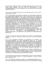 Die prozentualen Anteile der Anzahl an Unterhaltsberechtigten sind im Laufe der Jahre nahezu gleich geblieben. Fast die Hälte der Ratsuchenden ist ohne Unterhaltsberechtigte. Der Anteil Erwerbsloser unter den Beratenen liegt unverändert zwischen 45 bis 50 %. 10. Was sind die zehn häufigsten Ursachen, warum Schuldnerberatungen jährlich seit 2001 in Berlin in Anspruch genommen werden? Zu 10.: Überschuldung wird häufig durch unplanbare und einschneidende Änderungen der Lebensumstände ausgelöst. Dies ist nicht in jedem Fall mit der Ursache der Überschuldung gleichzusetzen. In den statistischen Erhebungen wird deshalb der wichtigste Auslöser der Überschuldungssituation erfasst. Die Variation der Rangfolge ist nur gering. Die nachfolgend genannten Prozentwerte bilden den Stand von 2018 ab. Bei den Ratsuchenden der Berliner Schuldner- und Insolvenzberatungsstellen nehmen die Arbeitslosigkeit (15,3 %) sowie Erkrankung und Sucht (16,7 %) seit Jahren kontinuierlich Spitzenplätze als Hauptauslöser der Überschuldung ein. Es folgt längerfristiges Niedrigeinkommen (11 %) Trennung, Scheidung und Tod der Partnerin/des Partners (10,3 %) und gescheiterte Selbständigkeit (9,5 %) sind ebenfalls häufige Hauptauslöser. In mehr als jedem fünften Fall wird unwirtschaftliche Haushaltsführung als ein Hauptauslöser der Überschuldung (21,6 %) benannt. Weitere Hauptauslöser, aber mit weitaus geringerem prozentualem Anteil sind Bürgschaft (Übernahme oder Mithaftung 2,7 %), Haushaltsgründung / Geburt eines Kindes (1,8 %), unzureichende Kredit-/Bürgschaftsberatung (1,7 %), Nichtinanspruchnahme von Sozialleistungen und gescheiterte Immobilienfinanzierung (jeweils 0,9 %). 11. Durch wen und wie oft werden die Qualifikationen und Angebote der Schuldnerberatungen hinsichtlich der hauptsächlich vorkommenden Ursachen überprüft und durch welche Maßnahmen angepasst? Zu 11.: Die Fachaufsicht hinsichtlich der Anerkennung von Schuldner- und Insolvenzberatungsstellen und deren Weiterbestand obliegt der für Soziales zuständigen Senatsverwaltung. Gemäß § 6 Absatz 3 des Berliner Ausführungsgesetzes zur Insolvenzordnung in Verbindung mit den dazugehörigen Ausführungsvorschriften (AV AGInsO vom 24.04.2018) Nr. 2 Absatz 6 sind die Stellen zum Nachweis des Fortbestehens der Anerkennungsvoraussetzungen verpflichtet, die vorgegebene halbjährliche Dokumentation der Beratungsarbeit (statistische Daten) vorzulegen und jährlich einen Tätigkeitsbericht mit dem Nachweis geeigneter Maßnahmen zur Qualitätssicherung zu erstellen. Zur Einschätzung der inhaltlichen Ausrichtung der Konzepte (einschließlich zum Beispiel von Fragen zur Präventionsarbeit) werden von den Trägern alljährlich Jahresberichte angefertigt, die an die Zuwendungsgeber (Bezirke) und parallel an die Fachaufsicht in der Senatsverwaltung übermittelt werden müssen. 12. Welchen Stellenwert misst der Senat der Schuldnerberatung in Berlin bei und welche Maßnahmen plant er konkret aus welchen Gründen und mit welchen Zielstellungen im Bereich der Berliner Schuldnerberatung bis 2021? Zu 12.: Die Arbeit der anerkannten Schuldner- und Insolvenzberatungsstellen ist von sehr hoher sozialpolitischer Bedeutung. Begrenzung des Schuldenanstiegs, Festigung 4