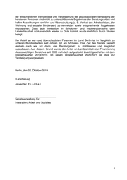 der wirtschaftlichen Verhältnisse und Verbesserung der psychosozialen Verfassung der beratenen Personen sind nicht zu unterschätzende Ergebnisse der Beratungsarbeit und helfen Auswirkungen von Ver- und Überschuldung (z. B. Verlust des Arbeitsplatzes, der Wohnung und sozialer Bindungen) zu vermeiden sowie entsprechende Folgekosten einzusparen. Dass jede Investition in Schuldner- und Insolvenzberatung dem Landeshaushalt schlussendlich wieder zu Gute kommt, wurde mehrfach durch Studien belegt. Der Anteil an ver- und überschuldeten Personen im Land Berlin ist im Vergleich zu anderen Bundesländern seit Jahren mit am höchsten. Das Ziel des Senats besteht deshalb nach wie vor darin, das Beratungsnetz zu stabilisieren und möglichst auszubauen. Aus diesem Grund wurde der Anteil an Landesmitteln zur Finanzierung dieses wichtigen Bereiches seit 2000 mehrfach aufgestockt. Zuletzt geschehen mit dem Doppelhaushalt 2018/2019. Im neuen Doppelhaushalt 2020/2021 ist dies zur Verstetigung vorgesehen. Berlin, den 02. Oktober 2019 In Vertretung Alexander F i s c h e r _____________________________ Senatsverwaltung für Integration, Arbeit und Soziales 5