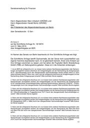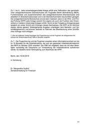 Senatsverwaltung für Finanzen Herrn Abgeordneten Marc Urbatsch (GRÜNE) und Herrn Abgeordneten Harald Moritz (GRÜNE) über den Präsidenten des Abgeordnetenhauses von Berlin über Senatskanzlei - G Sen - Antwort auf die Schriftliche Anfrage Nr. 18/18074 vom 01. März 2019 über Anlagenfreigabe am BER ----------------------------------------------------------------------------------------------------------------- Im Namen des Senats von Berlin beantworte ich Ihre Schriftliche Anfrage wie folgt: Die Schriftliche Anfrage betrifft Sachverhalte, die der Senat nicht ausschließlich aus eigener Kenntnis beantworten kann. Er ist gleichwohl bemüht, Ihnen eine Antwort auf Ihre Anfrage zukommen zu lassen und hat daher die Flughafen Berlin Brandenburg GmbH (FBB) um Stellungnahme gebeten. Diese ist in die Antworten einbezogen. 1. Ist am BER der erfolgreiche (d.h. es müssen keine weiteren Nachbesserungsarbeiten oder Nachprü- fungen durchgeführt werden) Abschluss der Anlagenfreigabe und der Nachprüfung der Anlagengruppe 04.01. (Sprinkleranlage) durch den übergeordneten Sachverständigen bereits erfolgt? Wenn ja, wann (bitte konkretes Datum)? Wenn nein, wann wird der erfolgreiche Abschluss der Anlagenfreigabe und der Nachprüfung dieser Anlagengruppe erwartet? Bitte konkreten Monat angeben 2. Wann wird der erfolgreiche Abschluss (d.h. es müssen keine weiteren Nachbesserungsarbeiten oder Nachprüfungen durchgeführt werden) der Anlagenfreigabe und der Nachprüfung der Anlagengruppe 03.04 (übergeordnete sicherheitsgerichtete speicherprogrammierbare Steuerung (ÜSSPS) – Entrau- chungsanlage) durch den übergeordneten Sachverständigen erwartet? Bitte konkreten Monat angeben 3. Wann wird der erfolgreiche Abschluss (d.h. es müssen keine weiteren Nachbesserungsarbeiten oder Nachprüfungen durchgeführt werden) der Anlagenfreigabe und der Nachprüfung der Anlagengruppe AG 05.1 (Brandmeldeanlage im Fluggastterminal „FGT“) durch den übergeordneten Sachverständigen er- wartet? Bitte konkreten Monat angeben 4. Wann wird der erfolgreiche Abschluss (d.h. es müssen keine weiteren Nachbesserungsarbeiten oder Nachprüfungen durchgeführt werden) der Anlagenfreigabe und der Nachprüfung der Anlagengruppe AG 06 Kabelgewerke (SSV u. SiBel) durch den übergeordneten Sachverständigen erwartet? Bitte konkre- ten Monat angeben. 5. Wann wird der erfolgreiche Abschluss (d.h. es müssen keine weiteren Nachbesserungsarbeiten oder Nachprüfungen durchgeführt werden) der Anlagenfreigabe und der Nachprüfung des Main-Pier-Nord und Main-Pier-Süd durch den übergeordneten Sachverständigen erwartet? Bitte konkreten Monat an- geben. 6. Wann wird der erfolgreiche Abschluss (d.h. es müssen keine weiteren Nachbesserungsarbeiten oder Nachprüfungen durchgeführt werden) der Anlagenfreigabe und der Nachprüfung des Fluggastterminals (FGT) durch den übergeordneten Sachverständigen erwartet? Bitte konkreten Monat angeben. 1/2