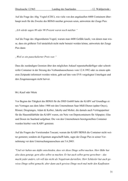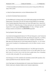 Drucksache 12/965 Landtag des Saarlandes - 12. Wahlperiode - Am 12.8.1992 fand eine Sitzung des Verbandsausschusses statt, in der der Ankauf der Depot- container behandelt wurde. Der Vorsitzende Prof. Bähr wies im Hinblick auf die Bedenken von Mitgliedern, „ob die Preise für die vom Verband zu übernehmenden Container, wegen des Zeitdrucks, nicht überhöht sind“, ausweislich des Sitzungsprotokolls auf Folgendes hin: „Der KABV würde nur gebrauchsfähige Depot-Container übernehmen. Diejenigen Depot- Container, die gem. der Bestandsaufnahme defekt seien, sollen, sofern noch möglich, vom Unternehmer auf dessen Kosten, ohne Berechnung des KABV, repariert werden.“ Daraufhin beschloss der Verbandsausschuss, den Verbandsvorsteher (Prof. Bähr) zum Kauf der zur Zeit im Saarland aufgestellten Depotcontainer für Glas und Papier zu den ausgehand- elten Preisen zu ermächtigen. Die genaue Anzahl der Depotcontainer ergebe sich nach Beend- igung der Bestandsaufnahme. Der Gesamtkaufpreis werde sich auf maximal ca. 3,9 Millionen DM zzgl. MWSt. belaufen. Der Betroffene Prof. Bähr schloss als Vertreter des KABV im Oktober 1992 mit den genannt- en Firmen Kaufverträge über deren Depotcontainer zu den ausgehandelten Pauschalpreisen. In den Verträgen wurde u.a. geregelt, dass der KABV nur gebrauchsfähige Depotcontainer erwerbe. Depotcontainer, die gemäß der zum Zeitpunkt des Vertragsabschlusses noch nicht beendeten Bestandsaufnahme defekt waren, sollte der jeweilige Verkäufer, ohne Berechnung an den KABV, reparieren. In einer Sitzung der Mitarbeiterkonferenz des KABV am 20.9.1003 unter Leitung des Betroff- enen Prof. Bähr wurde das Rechnungsprüfungsamt des KABV (RPA) beauftragt zu über- prüfen, „inwieweit die Rechnungen für Altcontainer beglichen wurden und inwieweit festge- stellte Mängel an diesen Containern von den Rechnungen abgezogen wurden. Ferner wurde das RPA gebeten, eine Liste zu erstellen, aus der zu ersehen ist, wie viel Altcontainer und in welchem Zustand sie übernommen wurden.“ Aus dem Vermerk des Rechnungsprüfungsamtes vom 15.10.1993 geht hervor, dass laut der Verträge Verbindlichkeiten in Höhe von 4.639.100 DM abzüglich der Reparaturkosten be- stünden. Der Vermerk führt weiter aus: 29
