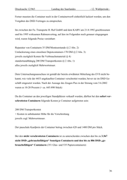 Drucksache 12/965 Landtag des Saarlandes - 12. Wahlperiode - Ferner mussten die Container noch in der Containerwerft einheitlich lackiert werden, um den Vorgaben des DSD-Vertrages zu entsprechen. Im zwischen der Fa. Transporte H. Ruf GmbH und dem KABV am 21.8.1992 geschlossenen und bis 1995 wirksamen Rahmenvertrag, auf den im Folgenden noch genauer eingegangen wird, waren folgende Preise vereinbart: Reparatur von Containern 35 DM/Monteurstunde (§ 2 Abs. 2) Umlackierung eines einzelnen Depotcontainers 170 DM (§ 2 Abs. 3) jeweils zuzüglich Kosten für Verbrauchsmaterial (§ 4) standortunabhängig 200 DM Transportkosten (§ 2 Abs. 1) alles jeweils zuzüglich Mehrwertsteuer. Dem Untersuchungsausschuss ist gemäß der bereits erwähnten Mitteilung des EVS nicht be- kannt, wie viele der 4453 angekauften Container verschrottet wurden, bevor sie im DSD Ge- schäft eingesetzt wurden. Nach der Aussage des Zeugen Pies in der Sitzung vom 5.6.2002 waren es 10-20 Prozent (= ca. 445-890 Stück) Da die Container an den jeweiligen Standplätzen verkauft wurden, dürften bei den sofort ver- schrotteten Containern folgende Kosten je Container aufgetreten sein: 200 DM Transportkosten + Kosten in unbekannter Höhe für die Verschrottung jeweils zzgl. Mehrwertsteuer. Der pauschale Kaufpreis der Container betrug zwischen 620 und 1400 DM pro Stück. Bei den nicht verschrotteten Containern ist zu unterscheiden zwischen den bis zu 3.567 nicht DSD-„gebrauchsfähigen“ Sonstigen Containern und den bis zu 886 DSD-„ge- brauchsfähigen“ Containern (351 Glas- und 535 Papiercontainern): 36