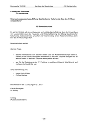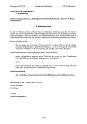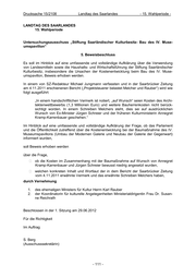 Drucksache 15/2108 Landtag des Saarlandes - 15. Wahlperiode - LANDTAG DES SAARLANDES 15. Wahlperiode Untersuchungsausschuss „Stiftung Saarländischer Kulturbesitz – Bau des IV. Muse- umspavillon“ 8. Beweisbeschluss In der Sitzung des Untersuchungsausschusses „Stiftung Saarländischer Kulturbesitz – Bau des IV. Museumspavillon“ vom 28.02.2012 sprach Herr Manfred Plaetrich von einer Stel- lungnahme der Staatskanzlei zu dem auf Seite 53 des Rechnungshofberichts geäußerten Vorwurf, dass die Staatskanzlei im Landtagsausschuss „Bildung, Kultur und Medien“ am 31.03.2011 „gegenüber dem Ausschuss Kostenangaben machte, die nicht dem aktuellen Stand entsprachen“. Er selbst konnte in der Sitzung des Untersuchungsausschusses ledig- lich eine Aussage aus seiner eigenen Erinnerung heraus tätigen. Im Hinblick auf eine umfassende und vollständige Aufklärung der Frage, ob das Parlament und die Öffentlichkeit zutreffend über die Kostenentwicklung bei der Baumaßnahme des IV. Museumspavillons (Umbau der Modernen Galerie und Neubau der Galerie der Gegen- wart) informiert wurden, soll Beweis erhoben werden über die Frage, ob das Parlament in der Sitzung des Ausschusses „Bildung, Kultur und Medien“ vom 31.03.2011 von der Landesregierung über die Höhe der Kosten getäuscht wurde, durch Vorlage der im Untersuchungsausschuss am 28.02.2012 von Herrn Plaetrich erwähnten Stellungnahme der Staatskanzlei gegenüber dem Rechnungshof. Beschlossen in der 1. Sitzung am 29.06.2012 Für die Richtigkeit Im Auftrag S. Berg (Ausschusssekretärin) - 114 -