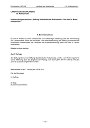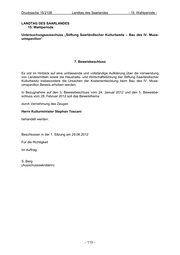Drucksache 15/2108 Landtag des Saarlandes - 15. Wahlperiode - LANDTAG DES SAARLANDES 15. Wahlperiode Untersuchungsausschuss „Stiftung Saarländischer Kulturbesitz – Bau des IV. Muse- umspavillon“ 6. Beweisbeschluss Es soll im Hinblick auf eine umfassende und vollständige Aufklärung über die Verwendung von Landesmitteln sowie die Haushalts- und Wirtschaftsführung der Stiftung Saarländischer Kulturbesitz insbesondere die Ursachen der Kostenentwicklung beim Bau des IV. Muse- umspavillon Beweis erhoben werden durch Vorlage der Stellungnahmen der Stiftung Saarländischer Kulturbesitz, welche vom Rechnungshof in seiner Mitteilung über das Ergebnis der Prüfung vom 03.11.2011 (PA IV 1/XIX-2-3-10) bis zum 15.02.20120 angefordert wurden. Beschlossen in der 1. Sitzung am 29.06.2012 Für die Richtigkeit Im Auftrag S. Berg (Ausschusssekretärin) - 112 -