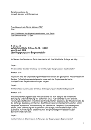 Senatsverwaltung für Umwelt, Verkehr und Klimaschutz Frau Abgeordnete Sibylle Meister (FDP) über den Präsidenten des Abgeordnetenhauses von Berlin über Senatskanzlei - G Sen - Antwort auf die Schriftliche Anfrage Nr. 18 / 15 692 vom 18. Juli 2018 über Begegnungszone Bergmannstraße Im Namen des Senats von Berlin beantworte ich Ihre Schriftliche Anfrage wie folgt: Frage 1: Wie bewertet der Senat die Umsetzung und Einrichtung der Begegnungszone Maaßenstraße? Antwort zu 1: Insgesamt wird die Umgestaltung der Maaßenstraße als ein gelungenes Pilotvorhaben der Berliner Fußverkehrsstrategie bewertet, was auch die Ergebnisse der bisher durchgeführten Begleituntersuchungen zeigen. Frage 2: Welche Schlüsse wurden aus der Einrichtung der Begegnungszone Maaßenstraße gezogen? Antwort zu 2: Wesentliche Planungsziele des Pilotvorhabens wie zum Beispiel die verkehrliche Beruhigung und die Erhöhung der Sicherheit für zu Fuß Gehende wurden erreicht. Handlungsbedarf besteht hinsichtlich der freiräumlichen Gestaltung der Maaßenstraße, da die bisherige Gestaltung im Rahmen des Pilotvorhabens mit einfachen baulichen Mitteln hergestellt worden war. In Abstimmung mit dem Bezirk Tempelhof-Schöneberg wird aktuell, unter Einbindung der Bürgerinnen und Bürger, ein Gesamtkonzept für die qualitative Aufwertung des Straßenraumes bei gleichzeitiger Verbesserung der Barrierefreiheit erarbeitet. Frage 3: Inwiefern fließen die Erkenntnisse in die Planungen der Begegnungszone Bergmannstraße? 1