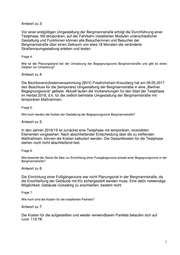 Frage 8: Wer ist für die Wartung der Parklets verantwortlich und welche Folgekosten entstehen durch Wartung und Reinigung? Antwort zu 8: Die Wartung der Parklets liegt in der Zuständigkeit des Bezirkes. Frage 9: Wie wird die Akzeptanz und die Nutzung der Parklets evaluiert? Antwort zu 9: Zwischen dem 9. April und dem 11. Mai 2018 konnten Interessierte die gewonnenen Eindrücke und Erfahrungen bei der Nutzung der Parklets durch Teilnahme an einer Befragung mitteilen. Auch danach eingehende Hinweise werden nach Möglichkeit bei der Planung der Testphase berücksichtigt. Frage 10: Nach welchen Kriterien wurde die Gestaltung der Parklets in Auftrag gegeben? Antwort zu 10: Für die Gestaltung der Parklets waren funktionelle und gestalterische Aspekte sowie Belange der Verkehrssicherheit von Bedeutung. Wichtig war dabei auch, dass die Parklets in verschiedene Straßenräume integrierbar und wieder verwendbar sind. Frage 11: Wie viele Entwürfe für die Gestaltung der Parklets gab es, wie war der Entscheidungsprozess zur Auswahl der Prototypen und wer bekam den Zuschlag? Antwort zu 11: Die bauliche Ausführung der Parklets ist das Ergebnis eines iterativen Prozesses an dem sowohl Verkehrs- als auch Freiraumplaner beteiligt waren. Im Rahmen eines Auswahlverfahrens hat ein Berliner Unternehmen den Zuschlag für die Herstellung der Parklets erhalten. Frage 12: Dürfen Gewerbetreibende oder die Anwohnerinnen und Anwohner die Parklets individuell und auf den Bedarf angepasst gestalten? a. Wenn nein, warum nicht? Antwort zu 12a: Die aufgestellten Parklets zeigen in ihrem Aufbau verschiedene funktionale Möglichkeiten (unter anderem Sitzgelegenheiten, Tische). Sie dienten als Muster für die Befragung der Anwohnerinnen und Anwohner. Im Rahmen der Testphase soll auf die Wünsche der 3