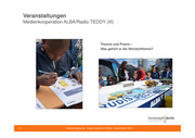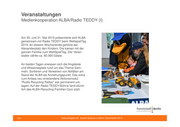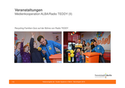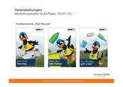 Veranstaltungen Medienkooperation ALBA/Radio TEDDY (V) Bereits im Vorfeld der Veranstaltung kooperierte ALBA mit Radio TEDDY. Es gab verschiedene Hörfunkspots, in denen zum richtigen Trennen von Wertstoffen motiviert wurde, in die Sender- rubriken "Nachgefragt" und "Dingsbums" wurde das Thema Recycling verstärkt einbezogen und auf der TEDDY-Internetseite puzzelten sich die Hörer ihr Lieblingsrecyclingmotiv. Mit diesen Maßnahmen konnte zusätzlich eine Bruttoreich- weite von über 3 Millionen Kontakten erzielt werden. Im November 2015 wurden die Spots erneut zwei Wochen ausgestrahlt. Parallel erfolgte online das Einbinden der Umwelttipps und des Recyclingpuzzles. 113 Nebenentgelte der Dualen Systeme in Berlin / Berichtsjahr 2015