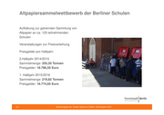 Altpapiersammelwettbewerb der Berliner Schulen Aufklärung zur getrennten Sammlung von Altpapier an ca. 125 teilnehmenden Schulen Veranstaltungen zur Preisverleihung Preisgelder pro Halbjahr: 2.Halbjahr 2014/2015 Sammelmenge: 255,20 Tonnen Preisgelder: 18.786,55 Euro 1. Halbjahr 2015/2016 Sammelmenge: 219,82 Tonnen Preisgelder: 16.774,65 Euro 121 Nebenentgelte der Dualen Systeme in Berlin / Berichtsjahr 2015