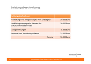 Leistungsbeschreibung Leistungsbeschreibung Gestaltung eines Imagekonzepts: Print und digital 30.000 Euro Aufklärungskampagne im Rahmen des 30.000 Euro Schulsammelwettbewerbs Anlagenführungen 5.000 Euro Personal- und Verwaltungsaufwand 25.000 Euro Summe 90.000 Euro 124 Nebenentgelte der Dualen Systeme in Berlin / Berichtsjahr 2015