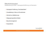 Die Trenntstadt Berlin hat einen Auftrag Prinzip der „Abfalltrennung“ in Deutschland weitgehend bekannt und gelernt Die Trenntstadt Berlin verankert ein ökologisches Abfallverhalten nachhaltig Zustimmung der Berlinerinnen und Berliner zur Abfalltrennung liegt bei 80% Die Trenntstadt Berlin fördert den Informationstransfer in die unterschiedlichen Zielgruppen aktive Beteiligung – je nach Müllsorte – zwischen 50 und 95%. „Zweifelnden Trennern“ liefert die Trenntstadt Berlin eine Bestätigung für das eigene Handeln „Noch-Nicht-Trennern“ bietet sie überzeugende Argumente für eine Verhaltensänderung Die Trenntstadt Berlin bietet anfassbare Aktionen und Projekte als Voraussetzung, um die Marke emotional aufzuladen und erlebbar zu machen Festigung und weiterer Ausbau der grundsätzlich positiven Einstellung der Allgemeinheit zur Abfalltrennung Die Trenntstadt Berlin nimmt eine Vorbildfunktion ein und gilt als State of the Art U. a. Darstellung auf der Bund-Länder-Konferenz 2016 und beim UBA 2 Beiratsitzung der Dualen Systeme in Berlin 13.12.2016