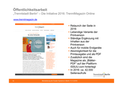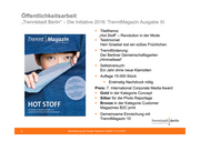 Öffentlichkeitsarbeit „Trenntstadt Berlin“ – Die Initiative 2016: TrenntMagazin Ausgabe XI Titelthema: „Hot Stoff“ – Revolution in der Mode Testimonial: Herr Graebel isst ein süßes Früchtchen Trenntförderung: Der Berliner Gemeinschaftsgarten „Himmelbeet“ Selbstversuch: Ein Jahr ohne neue Klamotten Auflage 15.000 Stück Erstmalig Nachdruck nötig Preis: 7. International Corporate Media Award Gold in der Kategorie Concept Silber für die Photo Reportage Bronze in der Kategorie Customer Magazines B2C print Gemeinsame Einreichung mit TrenntMagazin 10 12 Beiratsitzung der Dualen Systeme in Berlin 13.12.2016