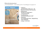 Öffentlichkeitsarbeit „Trenntstadt Berlin“ – Die Initiative 2016: TrenntMagazin Ausgabe XII Titelthema: „Auf die Schätze. Fertig. Los“ – die Baubranche entdeckt das Recycling Selbstversuch: Rundlauf mit Hindernissen – Turnschuhrecycling Trenntförderung: Karrikaturenwettbewerb „Müll“ Testimonial: Herr Graebel geht fremd…Begutachtung eines Fairphones Auflage 10.000 Stück 13 Beiratsitzung der Dualen Systeme in Berlin 13.12.2016